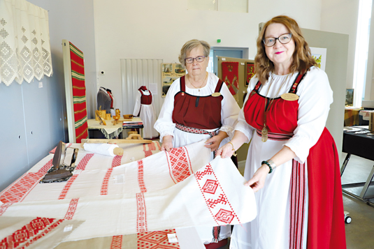 Kaksi karjalalaisiin kansallispukuihin eli fereseihin pukeutunutta naista vastaanottaa vierailijoita Ukonkantin kirjaston koulutussalissa. Sinne on pystytetty syyskuun alussa Muistoja Karjalasta ja karjalalaisia kädentöitä -näyttely, joka kestää 29.9. saakka.