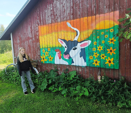 ”Maalla on kaikkialla luonnossa hienoja värejä ja siksi tein kuvasta värikkään. Kotona meillä ei ole lehmiä eikä kanoja, mutta kavereiden kotona on ja niin ne olivat helppoja piirtää. Tietysti olin iloinen, kun maalaukseni voitti ja sain vielä olla sitä sinne ladon seinään tekemässä. Mukava se on, kun kaikki tiellä kulkevat näkevät sen”, Anna Sotaheimo iloitsee.