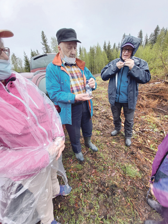 Viime vuonna yhdistys kävi joukolla istuttamassa puun taimia Sauli ja Liisa Takalon metsässä. Keskiviikkona luonnon voimia uhmaten yhdistys teki uuden metsäretken. Tarkoituksena oli katsastaa, miten taimet ovat selviytyneet talven yli. Sauli Takalo opasti, miten metsää kylvetään. Taisi olla aika monille uusi asia. Asta ja Sauli Toivonen olivat tehneet valmiiksi nuotion, jonka äärellä oli hyvä paistaa makkaraa ja laulaa tuttuja lauluja.