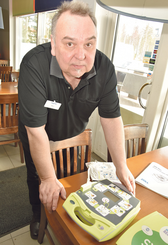 Yrittäjä Veli Tuomikoski päätti hankkia sydäniskurin Nesteen tiloihin, jossa se on tarvittaessa kaikkien saatavilla.
