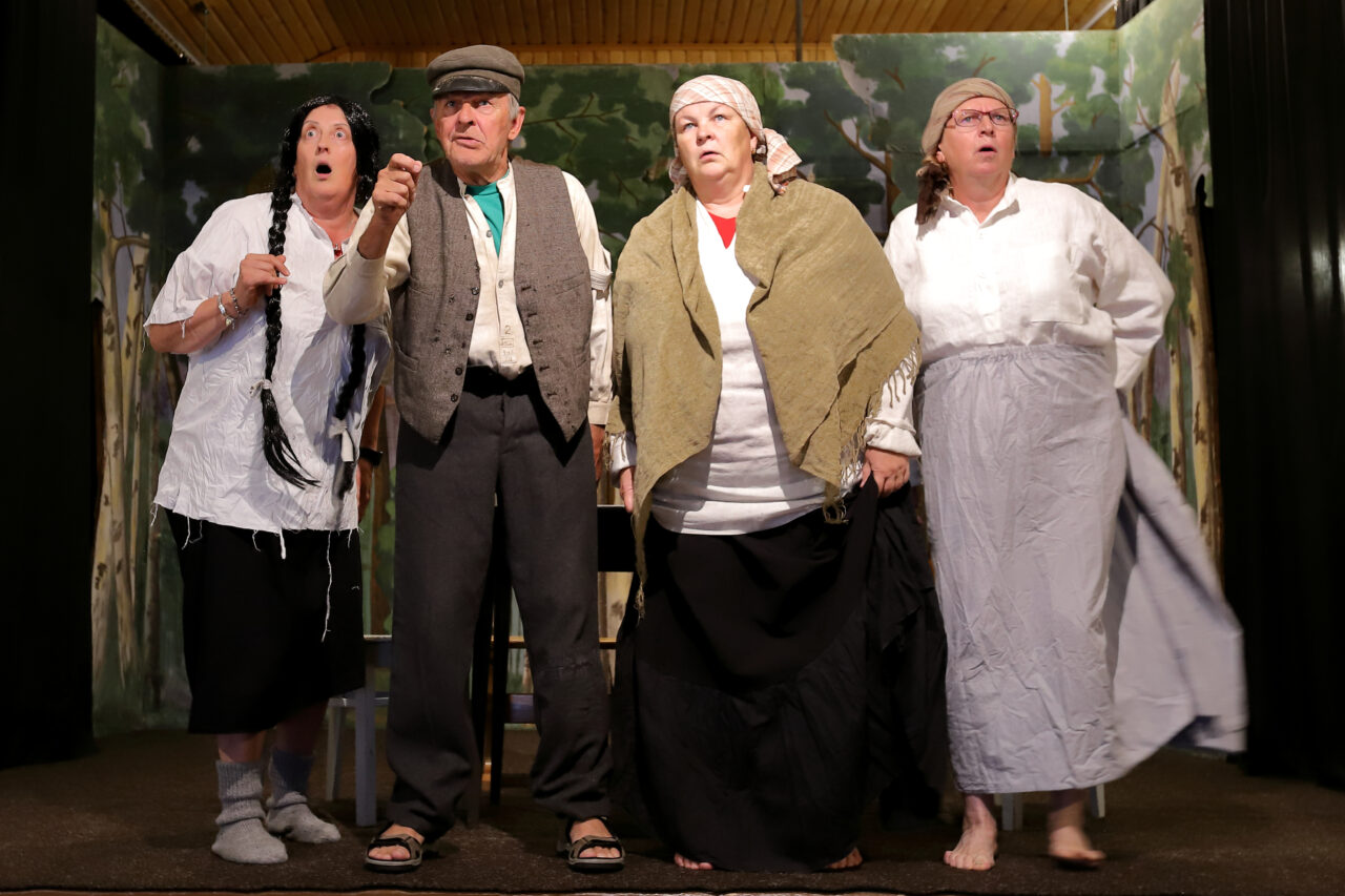 Kuvassa Alpuan Teatterin näyttelijät Sanna Leinonen, Esko Raitala, Suvi Mattila ja Asta Juntunen ovat syventyneet Impi Aronahon pakinoista dramatisoituihin pieniin näytöskappaleisiin. Kuva: Sari Jaatinen