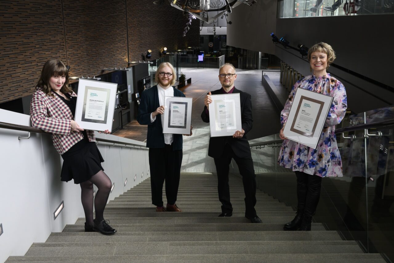 Vuoden 2022 Teosto-palkitut Sanna Ahvenjärvi ja Tapio Lappalainen (oik.) yhdessä kahden muun palkinnon voittajan, Helmi Kajasteen ja Mikko Sarvanteen kanssa. Kuva: Jussi Helttunen