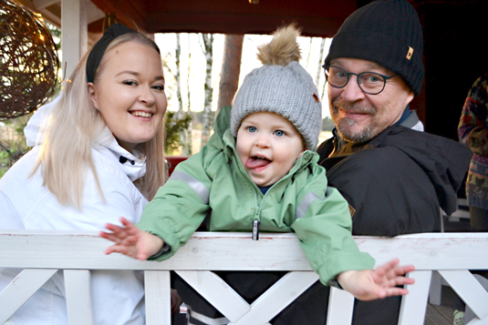Vastaanottovirkailija Julia Ulmonen ja hänen puolentoistavuoden ikäinen poikansa Finley Pullen ovat vierailulla Englannista Oulaisissa.