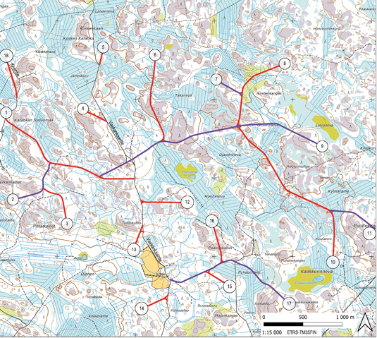 Uusien teiden nimet kartalla: 1. Karahkantie, 2. Jyrkänkalliontie, 3. Pitkänkalliontie, 4. Jäneskurunpisto, 5. Koskenpisto, 6. Takanevantaival, 7. Ikostenhaara, 8. Ikostenkaari, 9. Sydänmaantie, 10. Ruunakuruntie, 11. Puuttukankaanpolku, 12. Hanhinevantie, 13. Tullinkallionpisto, 14. Pahkalehdonpolku, 15. Puhdonperä, 16. Paarmakalliontie, 17. Kaakkurinkalliontie, 18. Kivenpolku.