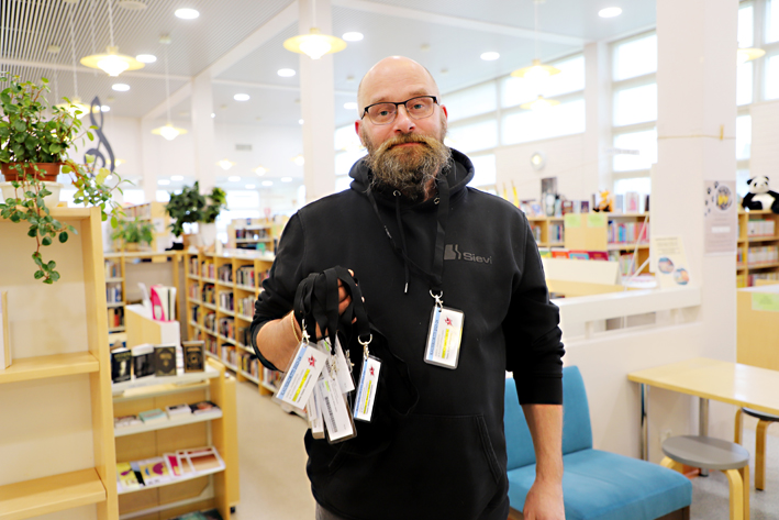 Miesten edustusjoukkue Cobrien joukkueenjohtaja Jarkko Laulumaa esittelee kymmentä kausikorttia, joita voi lainata Oulaisten kaupunginkirjastosta.