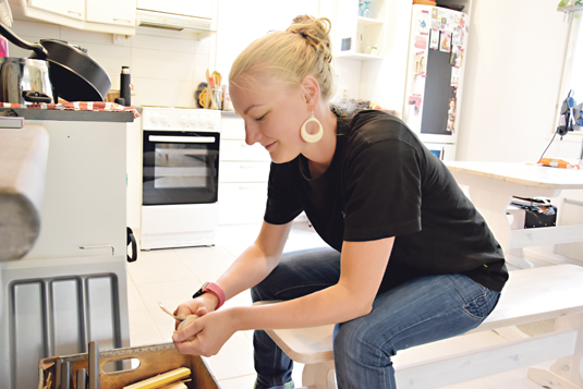 ”Mieheni on koulutukseltaan puualan artesaani, joten häneltä saan aina ammattilaisen neuvoja. Puukon käyttö on kuitenkin pitänyt opetella itse. Vielä ovat kaikki sormet paikoillaan, vaikka moni sitä aluksi epäili”, nauraa Pitja Simi.