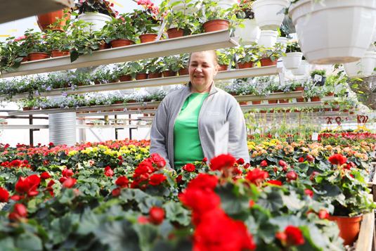 Tiina Anttila kertoo, että ensimmäinen kesäkukka, jota asiakkaat tulevat heiltä keväällä ostamaan, on yleensä orvokki. Kurkun ja tomaatin taimia menee myös paljon tässä vaiheessa vuotta.
