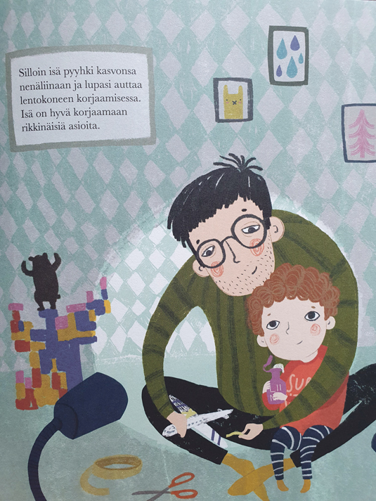 Malliuksen visuaalinen panos on vahva. Värit on murrettu synkiksi mutta harmonisiksi, ja niillä maalataan surun täyttämä arki juuri oikealta korkeudelta. Hautajaisissa näkyy vain mustiin pukeutuneiden aikuisten jalkoja, joita pitkin isoveli huristelee pienellä, keltaisella leikkiautolla. Vaikka kuvituskin pysyy konkretiassa, se tekee paikoin näkyväksi enemmän kuin teksti, mikä laajentaa ja monipuolistaa kerrontaa. Isoveljen paidassa lukee Superhero.
