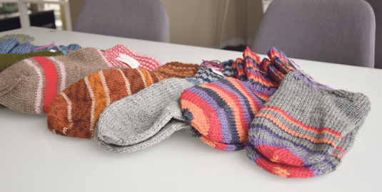 Valmiit sukat voi palauttaa Cafe Hilppaan. Kampanjassa mukana oleva Tanja Suvanto kertoo, että Hilppaan voi toimittaa myös pelkkiä lankoja.