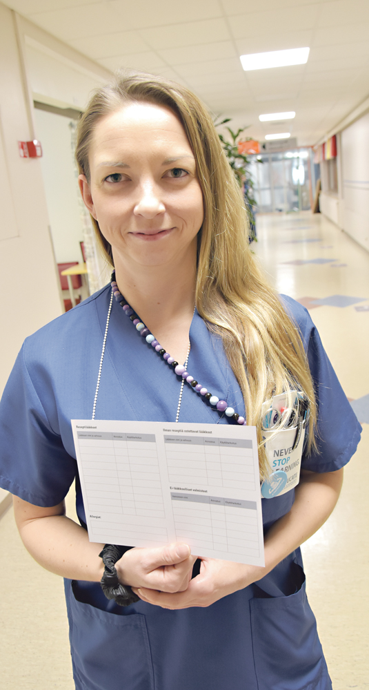 ”Asia on selvitettävä jo päivystyksessä, jotta lääkäri pystyy tekemään jo siinä vaiheessa lääkemuutokset, jotka pohjautuvat potilaan ajantasaiseen lääkitykseen”, toteaa sairaanhoitaja Susan Ollikainen sisä- ja keuhkotautien vuodeosastolta.