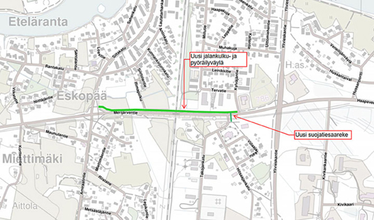 Suunnitelma sisältää jalankulku ja pyöräilyväylän suunnittelun Merijärventien varteen välillä Siltakatu – Takojankatu noin 700 metrin matkalle. Suunnitelma sisältää myös uuden Merijärventien ylittävän saarekkeellisen suojatien Takojankadun liittymässä. Lisäksi nykyinen tievalaistus parannetaan ja radan ylittävän sillan pintarakenteet uusitaan.
