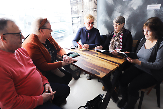 Perjantaiaamupäivä Cafe Herkutellassa. Viereisessä Olotilassa on meneillään yhteislaulutilaisuus, josta kantautuva musisointi tavoittaa myös kaikkien kahvilan puolella asioivien korvat. Yhdessä kahvilapöydässä palaveriaan pitävät Hannele Myllykangas, Terttu Lehtikangas, Asta Toivonen, Sauli Lehtikangas ja Asta Lohvansuu. Kokoontuminen liittyy Eläkeliiton Oulaisten yhdistyksen alulle panemaan hankkeeseen, jolla halutaan kannustaa +60-vuotiaat oulaistelaiset nousemaan ylös sohvan nurkasta ja lähtemään mukaan yhteisiin harrastuksiin.