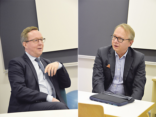 Elinkeinoministeri Mika Lintilä ja Osuuspankin pääekonomisti Reijo Heiskanen keskustelivat Oulaisten sekä koko maan talousnäkymistä maanantaina Oulaisissa.