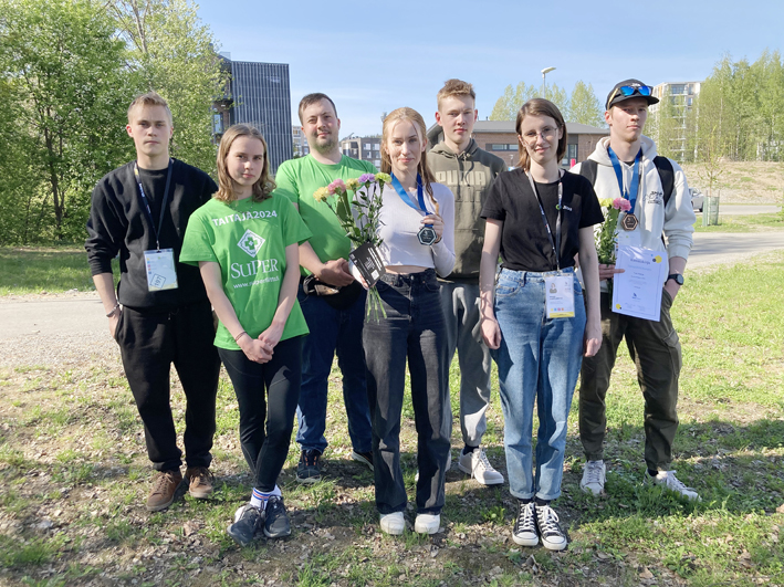 Eturivissä Sara Rasmus, Sara Tenkula ja Maiia Gortlishvili. Takana Jasper Rajamäki, Taneli Ketola, Leevi Nevalainen ja Toni Rahja.