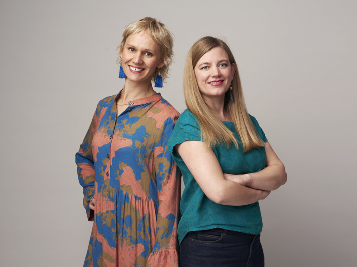 Oulaistelaislähtöinen Anna Elina Isoaro (oik.) ja helsinkiläinen Mira Mallius kirjoittivat lastenkirjan nimeltä Kaksi tätiä nimeltä Veera, joka on ehdolla tämän vuoden lastenkirjallisuuden Finlandia-palkinnon saajaksi. Kuva: Otto Virtanen/WSOY