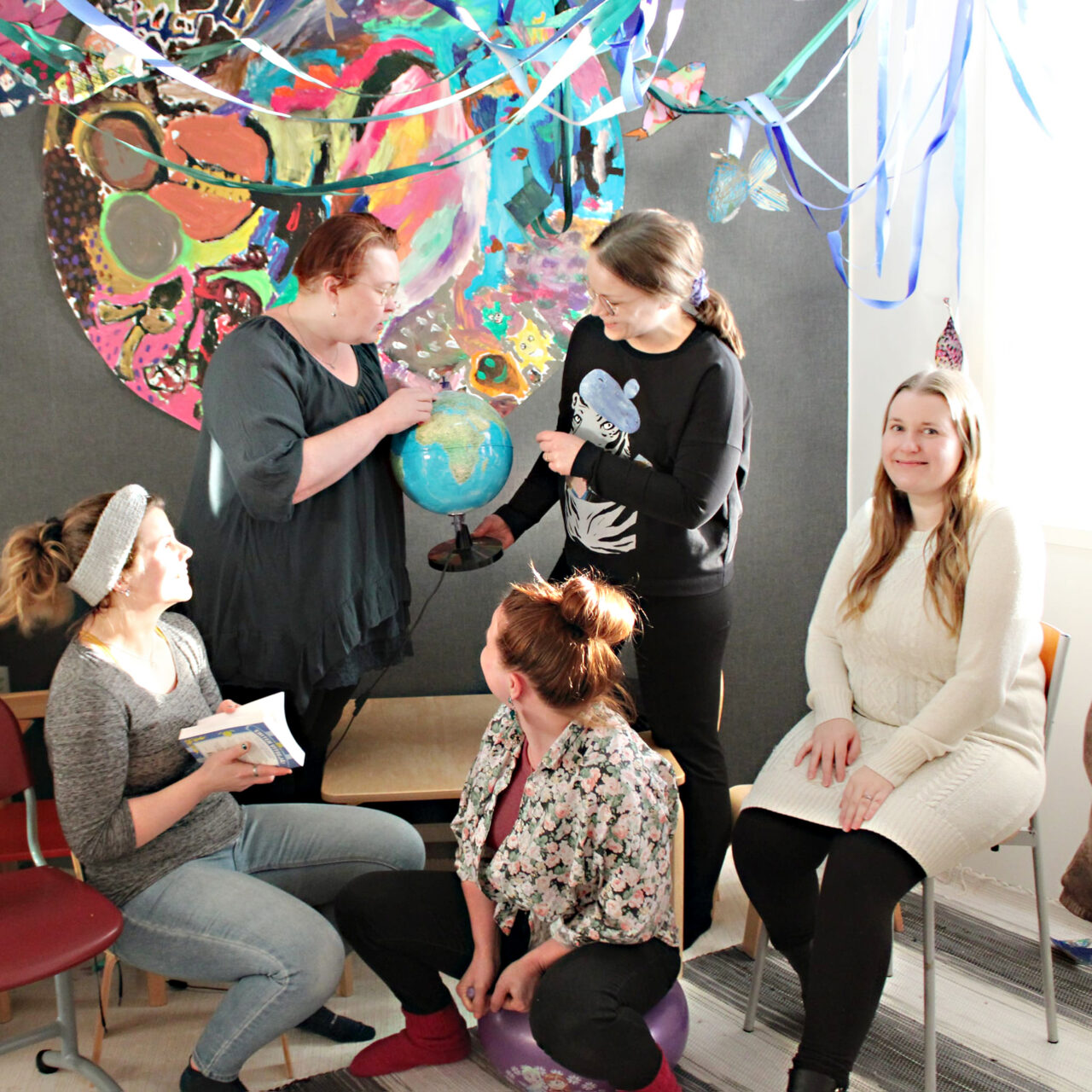 Oulainen2026-työryhmään kuuluvat Johanna Saarela, Essi Rahja, Wuokko Kärki, Jonna Taikatie ja Anna Ruotsalainen. Työryhmässä ovat mukana lisäksi kuvasta puuttuvat Oulaisten sivistys- ja kulttuurijohtaja Ari Sarpola sekä kulttuurituottaja Anna Koivukangas. Kuva: Tuula Aitto-oja