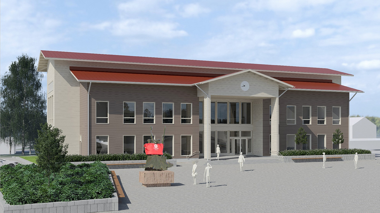 Tässä havainnekuva uudesta kunnantalosta, jonka on määrä valmistua viimeistään kesällä 2027.