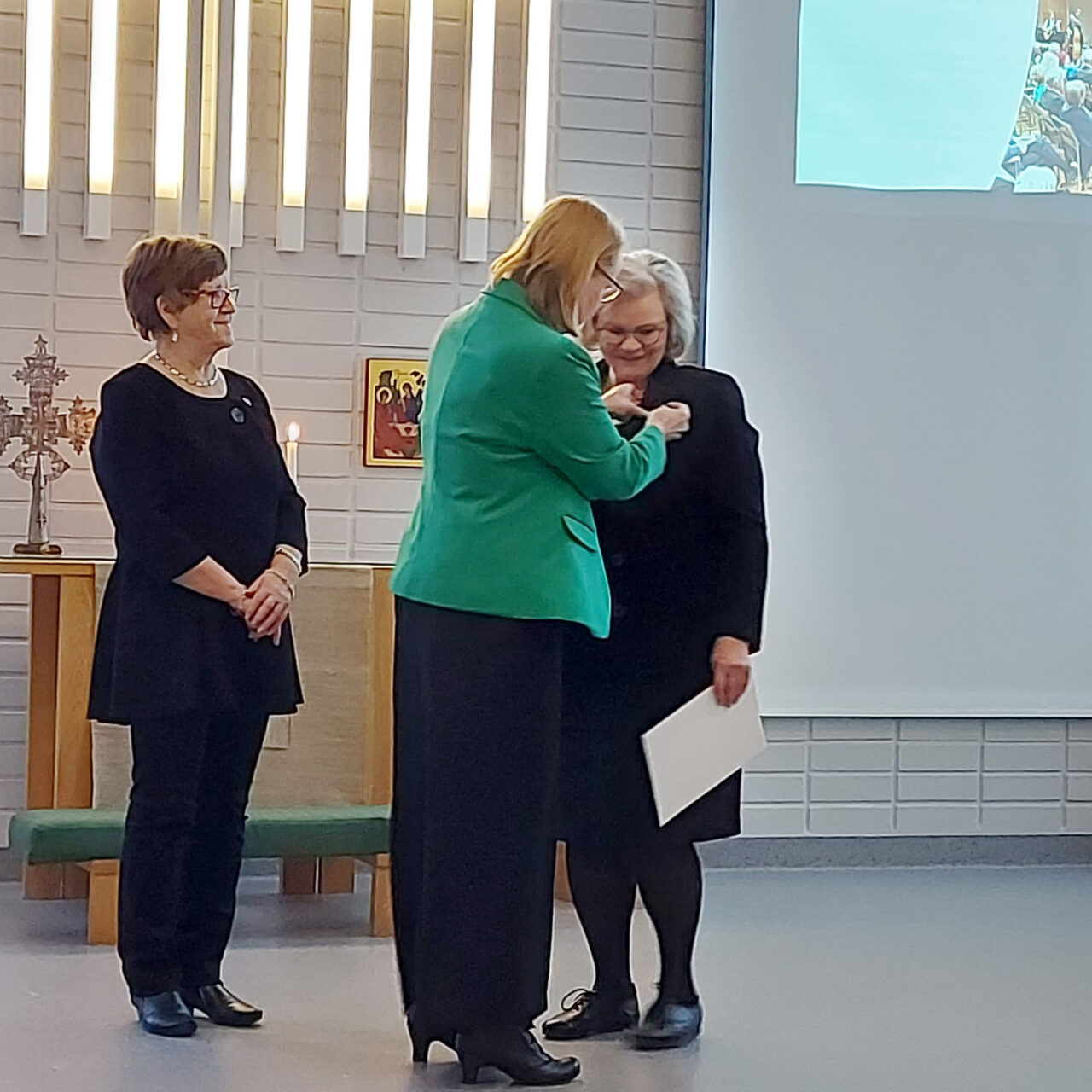 Nina Harjulehto kiinnittämässä mitalia Tuula Pajalan rintaan. Vieressä Elli Perikangas. Kuva: Tuula Aitto-oja