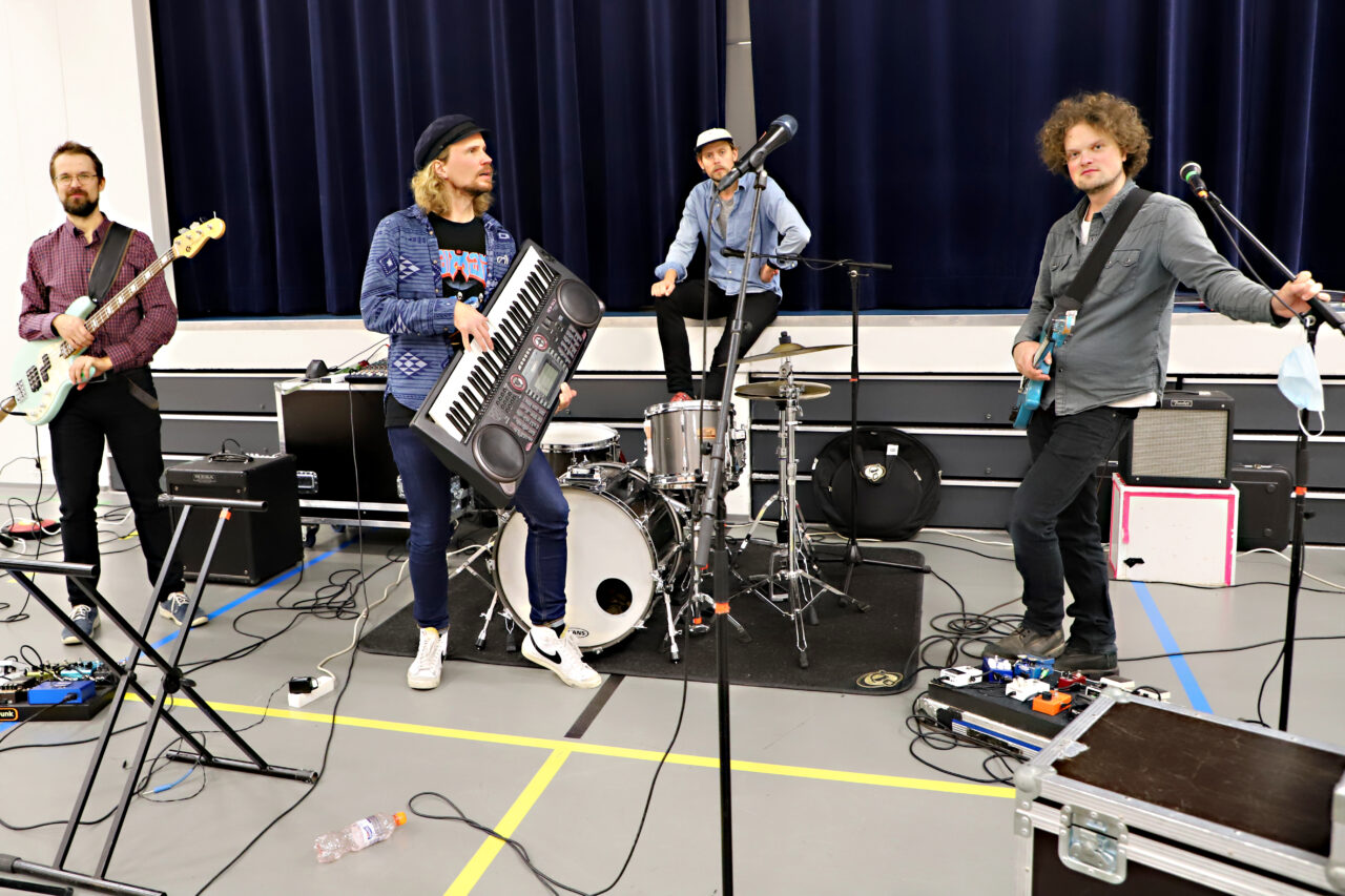 Suomirokkikoulu.fi -yhtye piti oulaistelaislapsille koulukonsertin maanantaina. Yhtyeessä soittavat basisti Kalle Ylitalo, laulaja Kimmo Numminen, rumpali Aapo Niininen ja kitaristi Esa Pottonen.