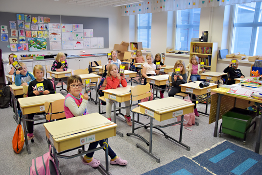 Juho Oksan koulun ekaluokkalaiset esittelevät oululaisen ValoStoren lahjoittamia valaisimia.
