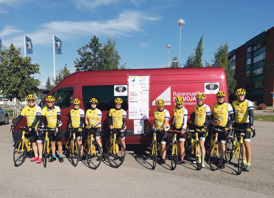 10 keltaisiin pyöräilyasuihin sonnustautunutta pyöräilijää on kokoontunut lauantaiaamuna Rakennusliike Sorvoja Oy:n pihalle. Kyse on Team Rynkeby – God Morgon Oulun joukkueesta, joka suuntaa kohta Oulaisista noin 135 kilometrin pituiselle pyörälenkille.