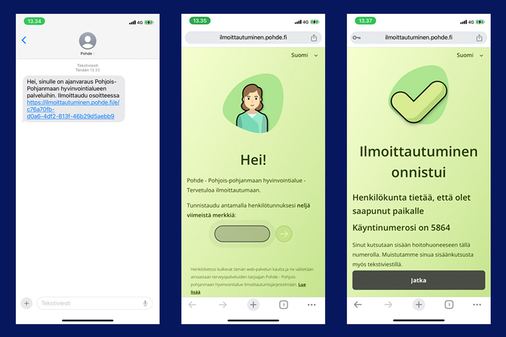Kun uusi ilmoittautumisjärjestelmä otetaan käyttöön, Haapajärven ja Oulaisten sosiaali- ja terveyskeskuksissa vastaanotoille voi ilmoittautua myös omalla älypuhelimella. Tekstiviesti ilmoittautumiseen tulee Pohteen nimissä 30 minuuttia ennen varattua aikaa. Viestin lähettäjän nimenä lukee ”Pohde”. Viestissä lukee: ”Hei, sinulle on ajanvaraus Pohjois-Pohjanmaan hyvinvointialueen palveluihin”. Linkki johtaa Axel Healthin -järjestelmään.