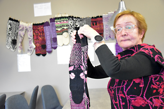 Sukkien lisäksi Ulla Suvanto on kutonut vauvojen potkupukuja sekä naapurille perinteisen villapuseron. Kutomisen lisäksi hän osallistuu Jokihelmen opiston neulontakurssille, jossa opeteltua on tullut muun muassa tällä hetkellä hyvin suosittua makrameesolmeilua.